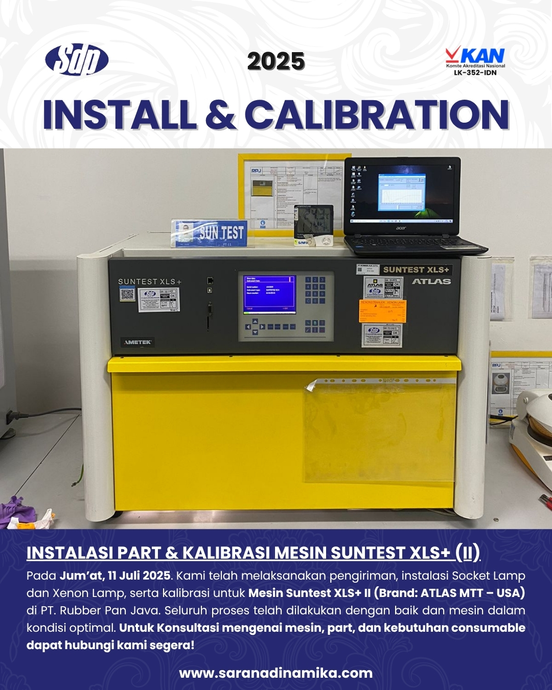 On Friday, July 11, 2025, we successfully carried out the delivery, installation of the Socket Lamp and Xenon Lamp, as well as calibration for the Suntest XLS+ II Machine (Brand: ATLAS MTT – USA) at PT. Rubber Pan Java. All procedures have been completed properly, and the machine is now operating in good condition.