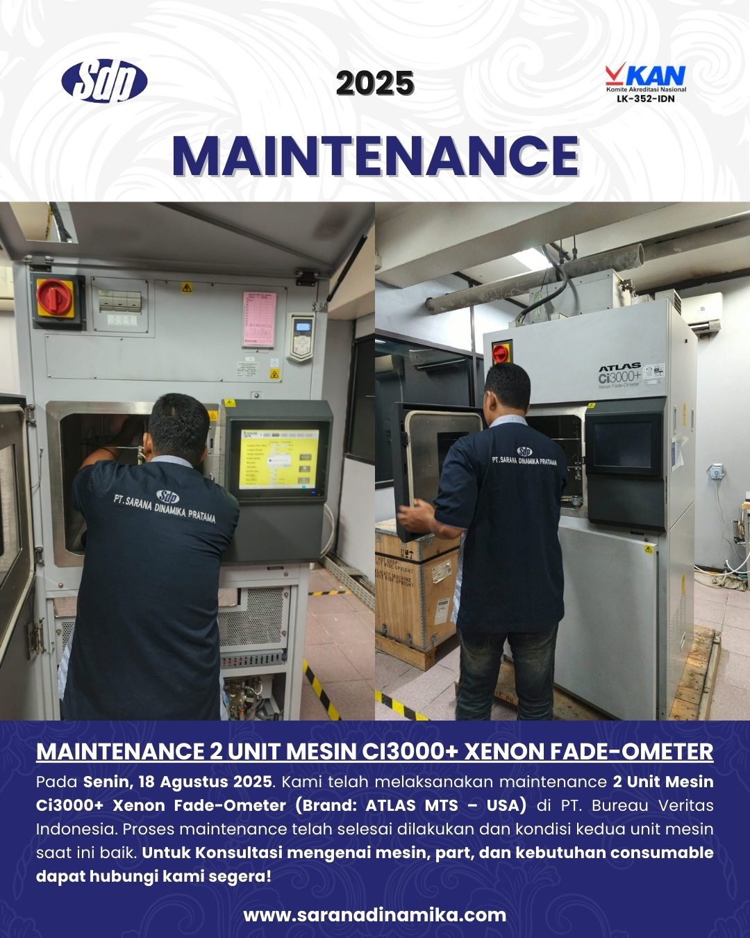 On Monday, 18 August 2025, we successfully carried out the maintenance of 2 units Ci3000+ Xenon Fade-Ometer (Brand: ATLAS MTS – USA) at PT. Bureau Veritas Indonesia. The maintenance process was completed successfully, and both machines are in good condition.