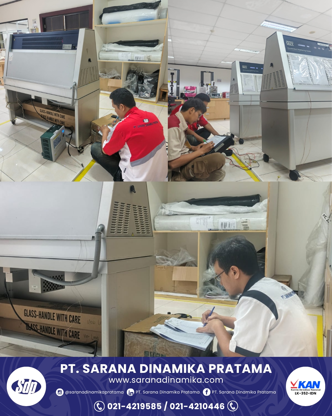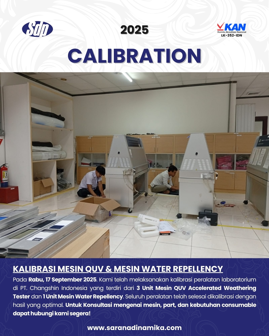On Wednesday, 17 September 2025, we successfully carried out the calibration of laboratory instruments owned by a manufacturing company engaged in the footwear industry, specifically producing sports shoes in the Karawang area, consisting of 3 units of QUV Accelerated Weathering Testers and 1 unit of Water Repellency Machine. All instruments have been calibrated with optimal results.