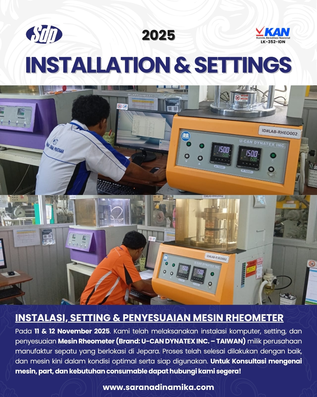 On 11 & 12 November 2025, we successfully carried out the computer installation, setting, and adjustment of the Rheometer Machine (Brand: U-CAN DYNATEX INC. – TAIWAN) owned by a footwear manufacturing company located in Jepara. The process was completed smoothly, and the machine is now in good condition and operating properly.